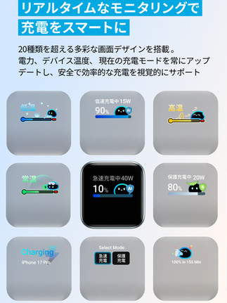 本製品はAnker独自のカスタムAIチップを搭載し、接続したiPhoneのモデル名を自動で検知してディスプレイに表示する。表示される情報はモデル名のほか、出力値・本体温度・充電の進行状況で、充電中の状態をリアルタイムで確認できる。対象はiPhone 13〜17シリーズ(iPhone 13・13 Pro・14・14 Pro・17eは対象外)。